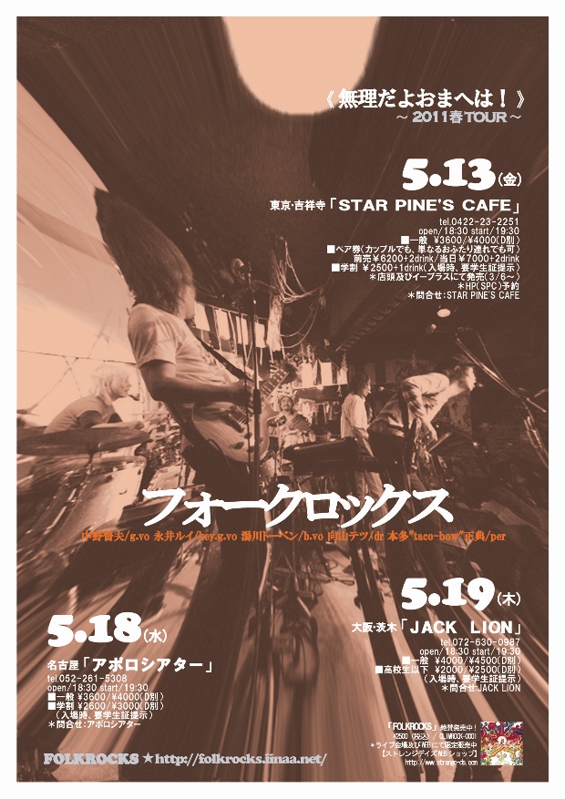 ◆2011/5/19(木) フォークロックス「無理だよおまへは!」 向山テツ(Vo&Dr/cocco,RED WARRIORS) 湯川トーベン(Vo&Ba/子供ばんど) 永井ルイ(Vo&Pf&Gt) 中野督夫(Vo&Gt/センチメンタルシティロマンス) taco-bow(Vo&Per/センチメンタルシティロマンス) その日は、メンバー到着するや否やトーベンさんのベースのなぞのノイズとエフェクターのゴム足修理と督さんのフェンダーアンプのリバーブユニットの補修で始まったのでした。 でね、これが完了した時点でなんか「今日は完璧とちゃう?!」って勝ちの空気感が漂ってきました。なんかいい予感。 さて、フォークロックスの大きな特徴にコンポーザーが3人もいるっていうことがあげられます。しかもそれぞれが凄腕アレンジャー、敏腕プロデューサーでもあり、しかも日本トップのロックミュージシャンとくれば、バンドのポテンシャルはとんでもないものであるということなのですが、フォークロックスはそれだけでは解明できないとてつもないエンターテイナー集団!しかも限りなくナチュラル。それがたまらんのです。 さぁ、この日はオープンからスタートまで60分あったのですが、この日の60分はちゃんと本来の意味を成しており、理想的でした。 そうよ、そうなのよ、この時間はお客さんに入ってもらうための時間でありますが、数十人に入っていただくのに60分もかからないわけで・・・つまりこの60分は、「スタートの準備」してもらうに大切な時間であるわけです。オープン早々お客さんには入場いただき、いい感じでアルコールも進んでいきます。う~~~ん、いい感じや。 ここでも今日の期待度の高さというか、盛り上がりの予感が高まってきたわけです。 で、スタート時間には、ほぼ満席。っていうか座れない方もいます。そしてあの膨らんだ空気。 腕の悪い気象予報士でも「100%嵐」を言い当てれる状況です。 で、始りました。 なんと、ど頭3曲アコースティックでスタート。督さん&トーベンさん&ルイさんのコーラスワークがすばらしい!テツさんもパーカッション。キタね。つかみは完璧! で、4曲目、バンドでなんと督さんのソロアルバムから「箱庭の街で」。意外でした。これがフォークロックスで聴けるなんて!近頃の貧しい日本語表現で言えば「ヤバイ」です。 もうそこからは・・・ 暴風っす! 楽曲、アレンジ、ボーカル。。。ひとつのカラーで納まらない展開の七変化であっという間にどんどんお客さんの腰を浮かします。またどうしてどうして、今日のお客さんのレスポンスもオリンピック出場クラスの良さと速さで、もうエライ事になっていくのであります。 もうその後のことは、文章では表現しきれません。 また、僕の撮った写真も自分が揺れすぎててとても人様にお見せできるようなものが一枚もなかったということをご報告申し上げます。 ですので、JSGのぐっちゃんとSachiyoちゃんのブログから無断で拝借! 冷静な2枚をどうぞ。 あぁ~えらいことでした。なぜあそこにあなたはいなかったのか? そんな風に問い詰めたいくらいに。。。 フォークロックスメンバーはひたすらステージの上で跳んで!走って!。フロアの老若男女はひたすら飲んで叫んで暴れておりましたとさ。 「無理だよおまへは!」 会場にいたすべての人が限界を迎えていたかもしれませんんね。(笑) これが「ライブハウス」です。 打ち上げもジャックのバンドマンも交じりいろいろあり。。。午前3時半終了! おつかれさまでした!そして、ありがとうございました!! Powered by 忍者ブログ Copyright © [ ヒゲおやじ三面記事 ] All Rights Reserved. http://higeoyazi.blog.shinobi.jp/ |
