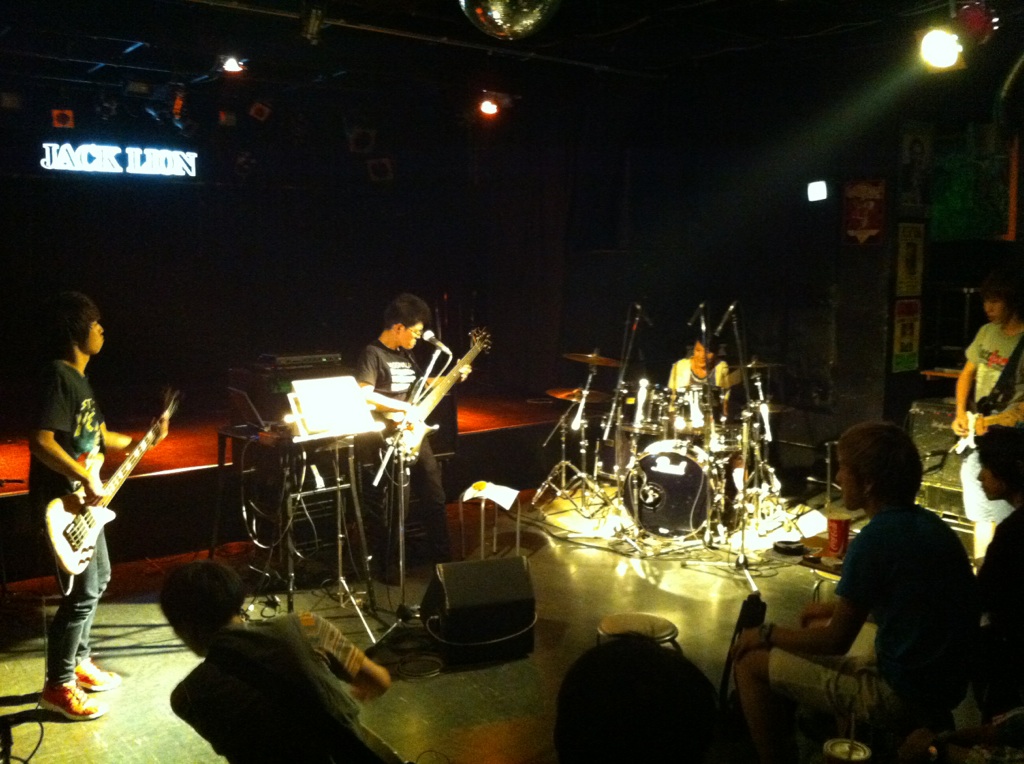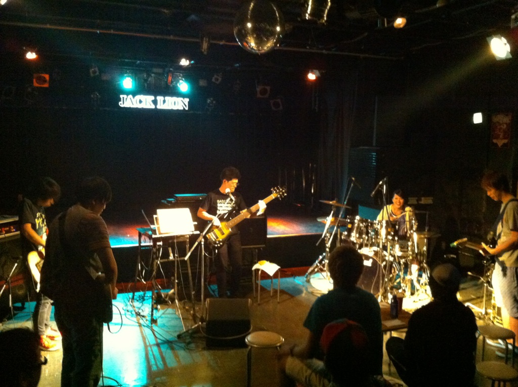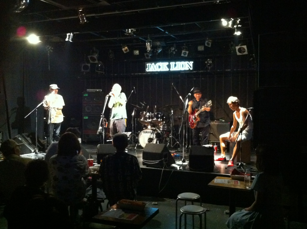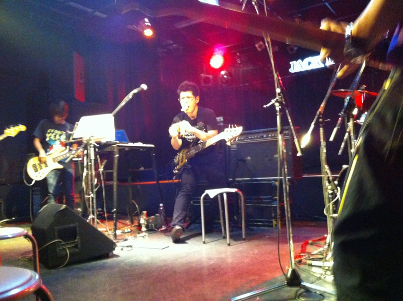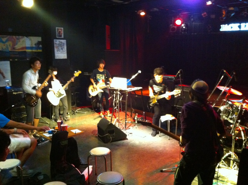 目指す結果が出なければ無駄だったということだ! それが無駄ではなかったというのを知るのはその次に何かに一生懸命になった時。 「今やってることは無駄ではないはず」なんていういい言葉で逃げ道を先に作るのは、夢中でない証拠。 出るはずの結果を逃すことになると僕は思います。 「いい言葉」は怖いのだ。 ◆2014/10/6(月) at JACK LION 金子マリPresents 5th element will 金子マリ(Vo)北京一(Vo,Mime)大西真(Ba)松本照夫(Dr)石井為人(Key) 窪田晴男(Gt/ex.パール兄弟)TAKU(Gt/韻シスト) 昨夜のマリさんのライブのDVDを見ています。 いいライブの日はリミッター解除された面倒くさい自分がそこにいます。 それをDVDで確認してちよいと凹む。 スミマセン。 が、卓のギターに初めて泣いた。 すげぇギタリストに乾杯! 昨夜はありがとう。 音楽の神様が笑ってた。 吉田このみちゃんが赤ちゃん連れてきたよ。 マリさんの言葉実践したのは彼女が初めて。 新しいページが開いた。 夢見ることで生まれる力は、そのまま夢を叶える力になる。 現実なんてあてにならんよ。 そもそも夢破れた人の話しか現実にはそばに無いやろ? 夢叶えた人の話はなかなか聞くことも出来ん。聞きたかったらわざわざそこに出向かないと聞くことが出来ないんよ。 そのことに気づかんと! ◆2014/7/25(金) AMIGO'S 八木のぶお(Hrap/Vo)大山大吾郎(Dr/Per)山田晴三(Ba/Vo/Kari)田中晴之(Gt/Vo) 先月の25日のライブ。 AMIGO'Sのこのコーナー。 まずベースの晴三さんがカリンバを持ち ドラムの大吾郎さんがカホーンに座る。 このコーナーで奏でられる音が年々僕には大きな存在になっています。 静かなアコースティックな響きのコーナーなのですが 生まれる世界がデカくて。 八木さんの天にも届きそうなハープ。 晴之さんのどうしたらそんな優しく弾けるんですかっていうくらいのギター。 リズミカルに豊かなハーモニーとメロディーを奏でる晴三さんのカリンバ。 他の誰とも違う、大吾郎さんからしか感じない土のにおいがする情熱的なカホーン。 果てしない。 ◆2014/7月19日(土) SPARK7 JAPAN TOUR 2014 ISAO(Gt) Thomas Lang(Dr) 大高清美(Key/CASIOPEA 3rd) 坂本尭之(Ba) Guest:TOSHI HIKETA(Gt) ISAO 8弦! Thomas ドラムセット! リハーサル そして本編佳境 どこまでも一心に音楽と向き合い、そして新しいものを生み出す。常に進化するとてつもない努力。 ISAOの姿に毎回感銘を受けます。彼がいなかったら僕はどこかで何かをあきらめてしまってたかもしれません。 昨夜もまたそうでした。 世界を股にかけるミュージシャンが横江2丁目ジャックライオンの4×8mのステージに乗っかって音を出す。正直いろんな面でギリギリです。いやアウトもあります。 だけどISAOは必ずここへ帰ってきてここにいるみんなに生き様を見せてくれます。 そのことがこれからどういう意味や成果を成してゆくのか。とても意味深いものを感じています。 ISAOは7弦から8弦になりました。その1本がどれだけ大きな人間的な意味も含んでいるのか興味を持ってもらいたかったりします。特にISAOを知ってる地元の人に。 うちの箱はイベンターの入らないブッキングばかり。 プロのライブもオープン以来99%紹介紹介の数珠つなぎ。 海外からのアーティストもそう。 だから僕らががんばってアーティストと共にチケットを販売してます。 成功も失敗も自己責任。きっとそれが本来のライブハウスの姿。 頑固に楽しんでます。 ◆2014/7/3(木) 今沢カゲロウ16thアルバム"HOPE"発売記念 BASSNINJA wired TOUR 2014 今日は12名でのワイヤード! Keyも決めず、まずは赤石(Gt)とのデュオで始まり! 今井くん(Gt)が加わり ちゃあ(Ba)が加わる そして、れいこ(Dr)が入り 展開していきます。どこへ行くかは誰にもわかりません。 高校生の小西くん(Gt)、やっそ(Ba)入って じゅん(Gt)がくる カゲロウ氏になにやら動きが・・・ カゲロウ氏のバナナ食い奏法がすべてを決定付けた。 落ちたバナナの処理を見て今日の題名を「3秒ルール」と僕は名づけてみた。 ヒライデくん(Ba)とマコ(Gt)とヒロキ(Dr)が あれっ?中根(Ba)の写真が抜けてる。笑 そんなわけで今日の作品「3秒ルール」は今日の12名の共作で出来上がりました。 中身の説明は要らんでしょ? ってか やっぱ現場で会いましょう! カゲロウさん、ありがとうございました! 『音楽の聞き手の側が、音を聴いてるのか曲を聴いてるのか・・・』 これはネットのインタビューで読んだあるDJの言葉。 そのDJも危機を感じてる。 なるほどその通りやなぁ。 僕のこだわりたいところもその「音を聴く」人の市場をもっと大きくしたいわけや。 そう、バンドやねんから! その比率がもっとええ具合になるはずやという期待が大きいわけです。 まだまだ市場は開拓できる! それが今から叶えたい夢です。 そのために「音」にこだわる人たちの「ホンモノの音」を"生きてるうち"に直に届ける必要があり、 そのためにこれからのライブハウスがあるのでしょうから。 いただきました。 昨日のライブの一枚。 絵になるがな。あざ~す! DAITO ROCK CITY 2014.6.8 at 